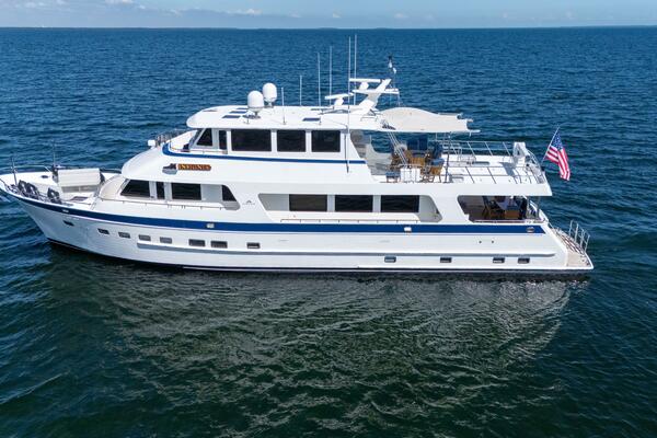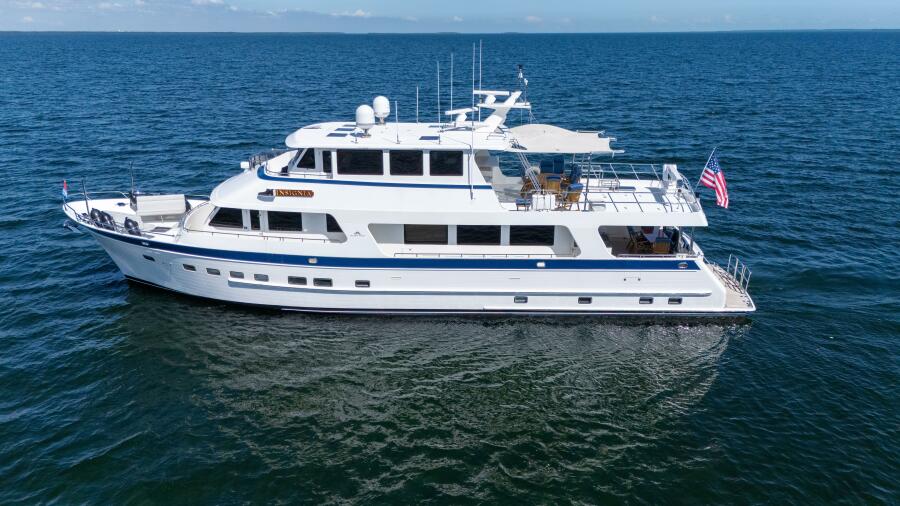 This exceptional Outer Reef 860 Deluxbridge “Insignia” combines long-range capability, superior craftsmanship, and luxurious comfort in a truly remarkable yacht. Powered by 1,600hp CAT C-32 engines and featuring a 4,000-gallon fuel capacity, she’s built for adventure with impressive range and performance. Her custom interior and extensive soundproofing upgrades ensure a quiet, refined cruising experience, while her fold-down mast, removable satellite domes, and reduced 20' 6" air draft make bridge clearance effortless, perfect for inland passages like the Erie Barge Canal. The innovative Deluxbridge layout offers three spacious owner and guest cabins, two crew cabins, and a vast country kitchen in place of a traditional helm, creating a warm, open environment ideal for entertaining. A generous skylounge adds even more private living and dining space, echoing the comfort of yachts over 100 feet. Outfitted with Trac Zero Speed stabilizers, 55hp hydraulic bow and stern thrusters, twin 38kW Northern Lights generators, and an advanced electronics and AV suite, this 860 Deluxbridge represents the pinnacle of Outer Reef’s design—a yacht that masterfully blends power, practicality, and contemporary elegance.