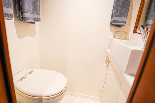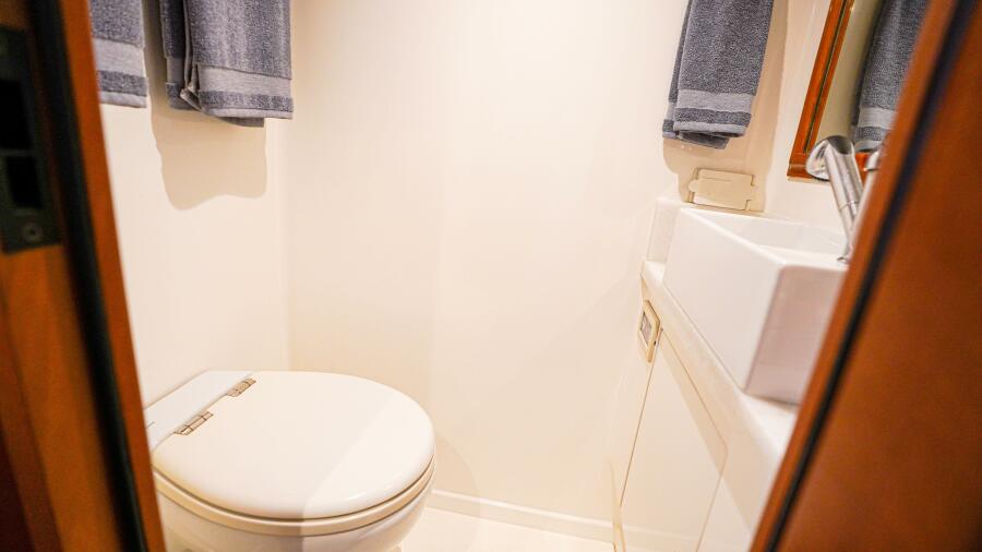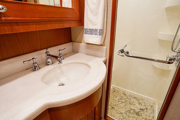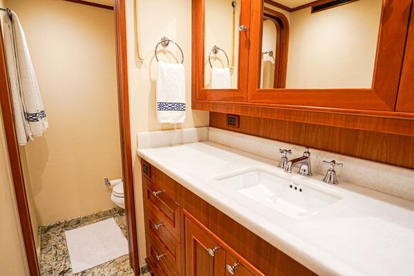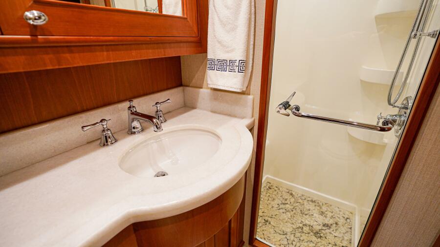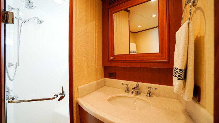 The lower accommodations are accessed via a stairway forward of the galley. The VIP stateroom features generous hanging locker space and a private ensuite head with shower. Just aft, the port guest stateroom offers twin berths and an ensuite head.