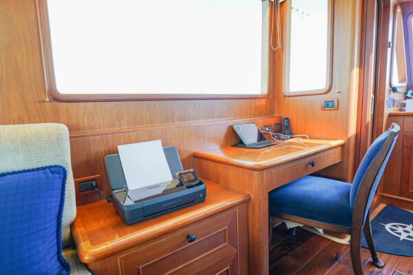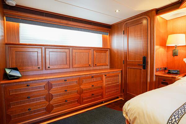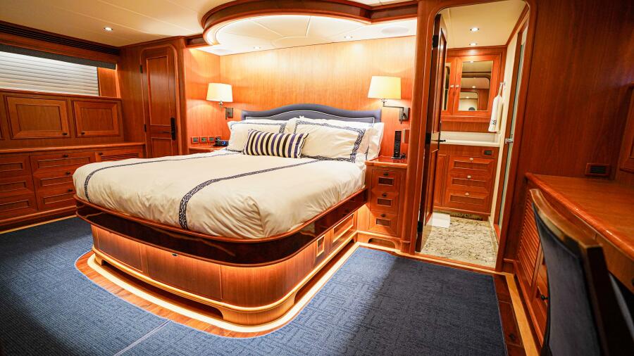 - Starboard captain's crew cabin with one (1) queen berth with a custom mattress with storage drawers underneathwith burl on berth surround