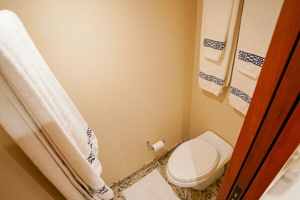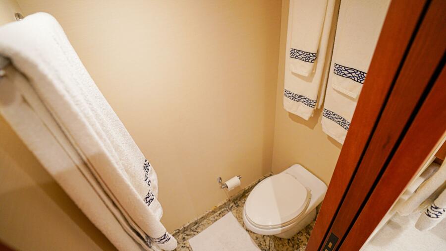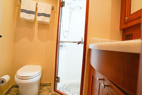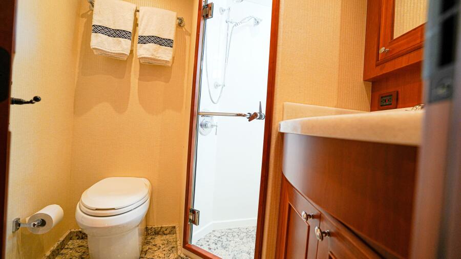 The full-beam master suite is accessed through a private hallway that also includes a washer/dryer and folding counter. The master features a centerline king berth, a luxurious ensuite with honed granite flooring and polished countertops, a large walk-in locker, and an extensive bank of drawers for storage - combining elegance, comfort, and practicality in one serene retreat.