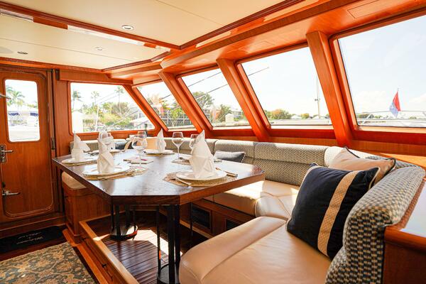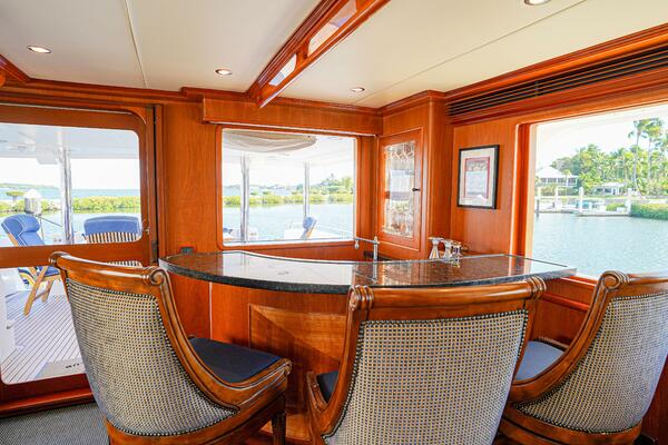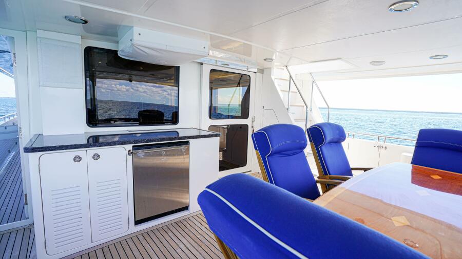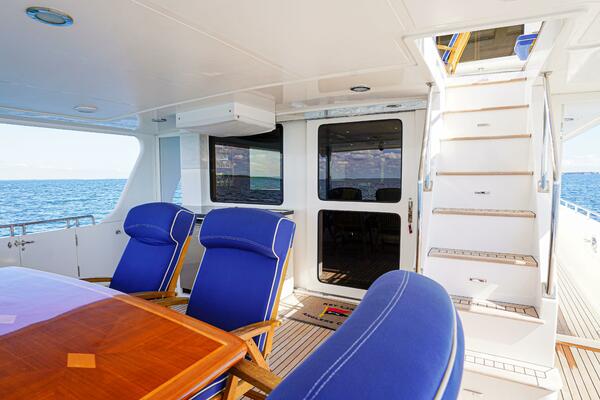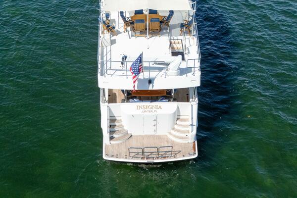 From the moment you step aboard INSIGNIA, it’s clear she was originally commissioned by an exceptionally knowledgeable and detail-oriented owner. Her spacious aft deck sets the tone, featuring a large teak dining table with matching chairs, perfect for alfresco entertaining. To port, a built-in cabinet houses an air-conditioning unit, custom storage, and a granite countertop, while a fiberglass staircase provides safe, easy access to the boat deck above.