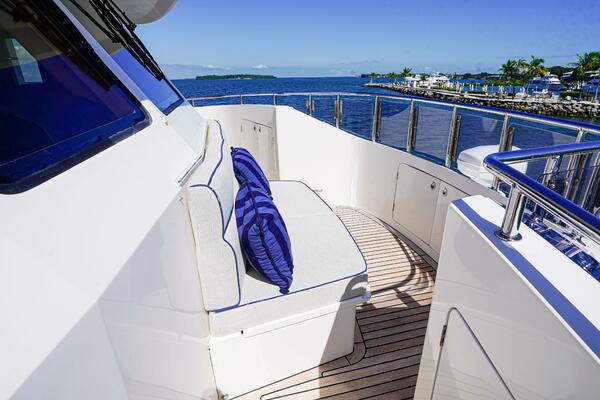 The foredeck features Portuguese bridge seating, custom fold-down seats on both sides, and a removable sunshade, along with dual hydraulic vertical windlasses and fresh and raw water washdowns, a perfect combination of comfort and functionality.