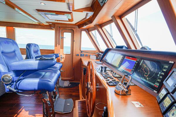 The skylounge, accessed via a starboard stairway from the galley, serves as the yacht’s command center. The pilothouse is equipped with Garmin navigation systems with four redundant screens, Caterpillar engine monitors, and multiple multifunction displays, ensuring total confidence underway. This level also includes an on-deck head and port and starboard doors leading to the Portuguese bridge seating area.