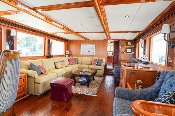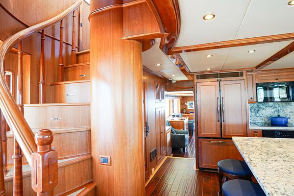 Entering the main salon through the sliding glass doors, you’re immediately struck by the craftsmanship and attention to detail, from the custom bar area with a built-in glass curio cabinet and abundant storage to the dual overhead cherry handrails and high-gloss burl countertops that beautifully complement the custom furnishings. The hand-scraped walnut flooring throughout enhances the yacht’s refined and timeless aesthetic.