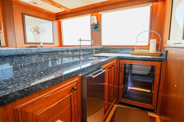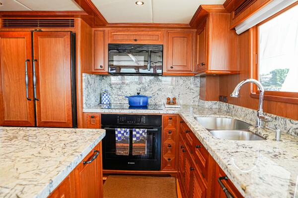 Forward of the salon lies the expansive country-style galley, designed for both form and function. Outfitted with full-size, wood-paneled appliances, granite countertops, and a large island with seating for three, this space is ideal for entertaining or extended cruising. A settee for eight sits forward of the island, and an on-deck day head is conveniently accessible from both the galley and the starboard walkaround deck.
