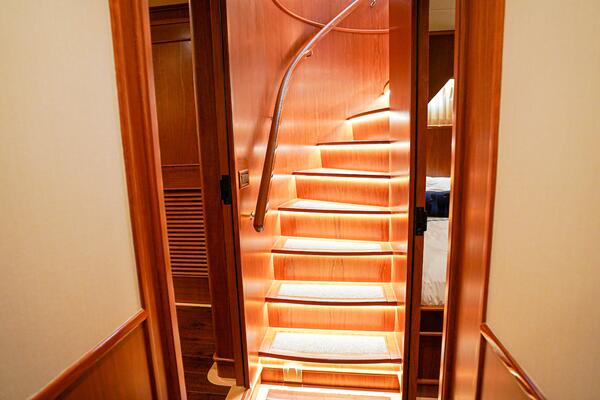To starboard aft, an internal staircase leads to the crew quarters, which include a comfortable crew lounge/galley, two staterooms, and direct access to the air-conditioned engine room.